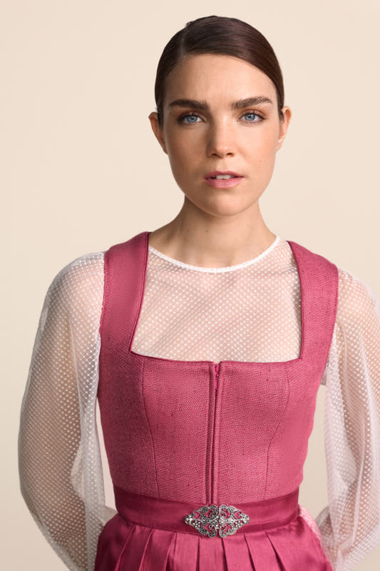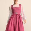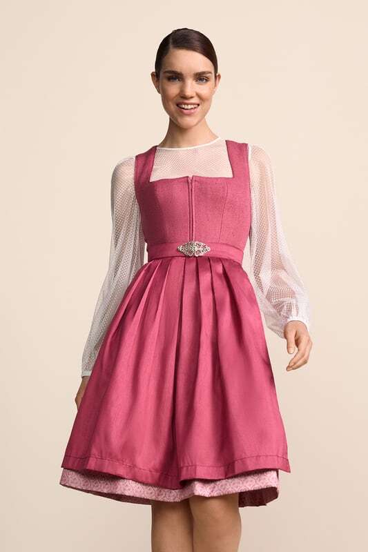 Eleganz trifft auf modernen Charme – unser Dirndl Darelia zieht sofort alle Blicke auf sich. Das unifarbene Mieder mit geradem Ausschnitt setzt das Dekolleté stilvoll in Szene, während der Rock mit einem oppulent schimmernden Muster einen edlen Akzent setzt. Ein praktischer Reißverschluss vorne sorgt für unkompliziertes An- und Ausziehen. Abgerundet wird das Ensemble durch eine schicke Schürze mit hochwertiger Schnalle, die das Outfit harmonisch ergänzt. Mit einer Rocklänge von 60cm endet das Dirndl unter dem Knie und verleiht jedem Auftritt einen modernen, festlichen Touch.
