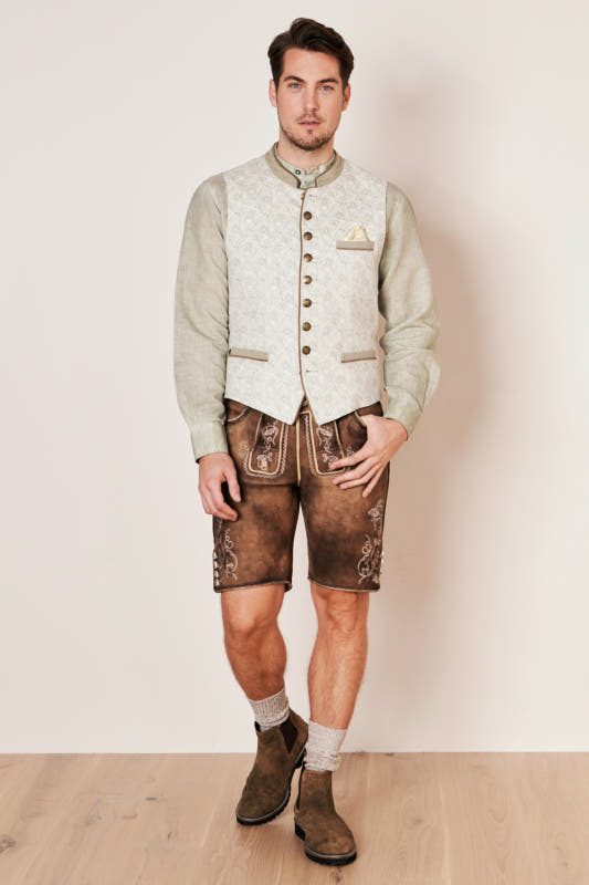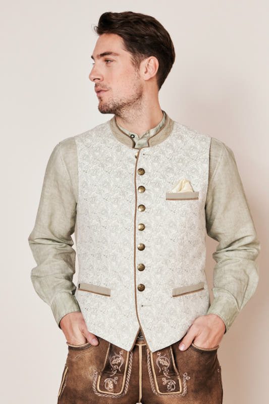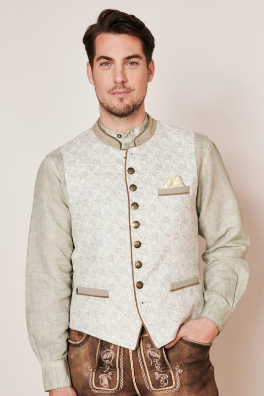 Die Trachtenweste Ivan ist ein echter Blickfang! Die Weste überzeugt mit einem tollen Ornament-Muster und einer Knopfleiste. Die Weste lässt sich perfekt zu Trachtenhemd und Lederhose kombinieren.