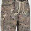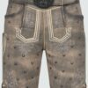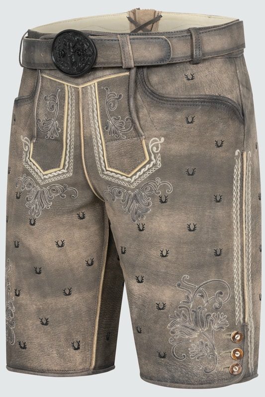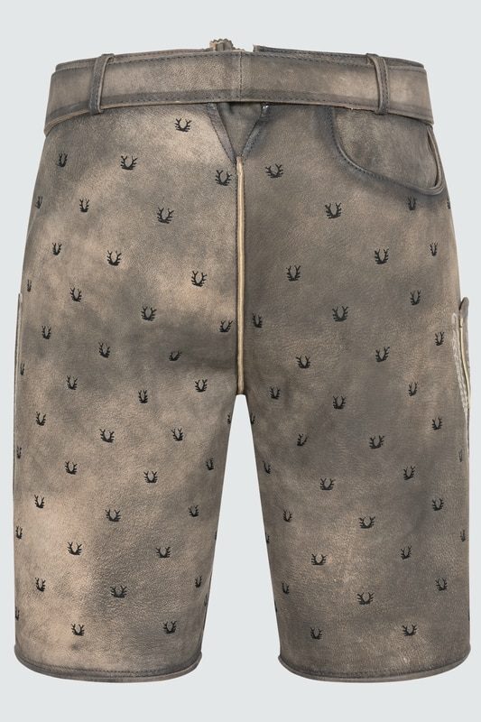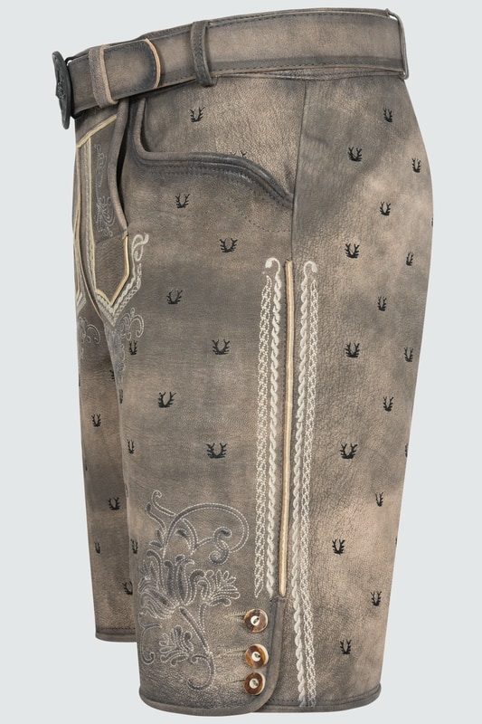 Stylische Lederhose. Die Lederhose Harvey verfügt über viele kleine Hirschgeweih-Stickereien und weitere aufwenidge Stickereien entlang des Latzes und der Hosenbeine. Perfekt für einen Besuch auf der Wiesn oder dem Cannstatter Wasen. Die Lederhose wurde aus hochwertigem Ziegenleder gewonnen.
