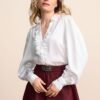 Unsere Sportbluse Luminara überzeugt mit einem femininen Design und liebevollen Details. Der klassische Kentkragen und die durchgehende Knopfleiste verleihen ihr eine zeitlose Note, während der V-Ausschnitt für eine schmeichelhafte Silhouette sorgt. Verspielte Spitzendetails an den langen Ärmeln setzen zarte Akzente und machen die Bluse zu einem stilvollen Hingucker. Ideal für lässige Alltagslooks mit einem Hauch Eleganz.