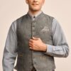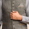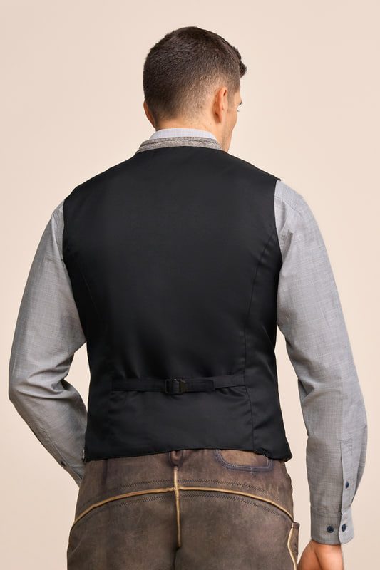 Traditionelle Trachtenweste zum Knöpfen. Die farblich hervorgehobenen Taschenschlitze und der leichte Stehkragen betonen den Trachtenlook.